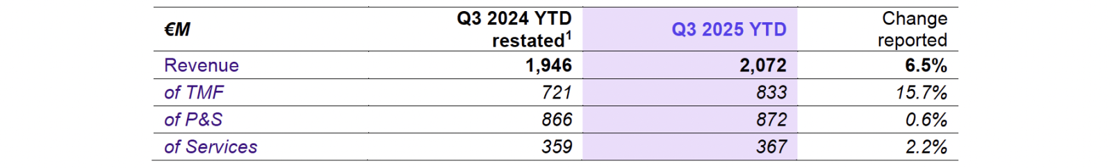 At the end of September 2025, Econocom posted year-to-date revenue of €2,072 million, up by 6.5% on a reported basis and 5.1% on an organic basis, compared to 2024 restated revenue on the same period. This performance reflects the Group’s sustained commercial momentum, supported by TMF activities, the resilience of our P&S activity and the contribution of our acquisitions.